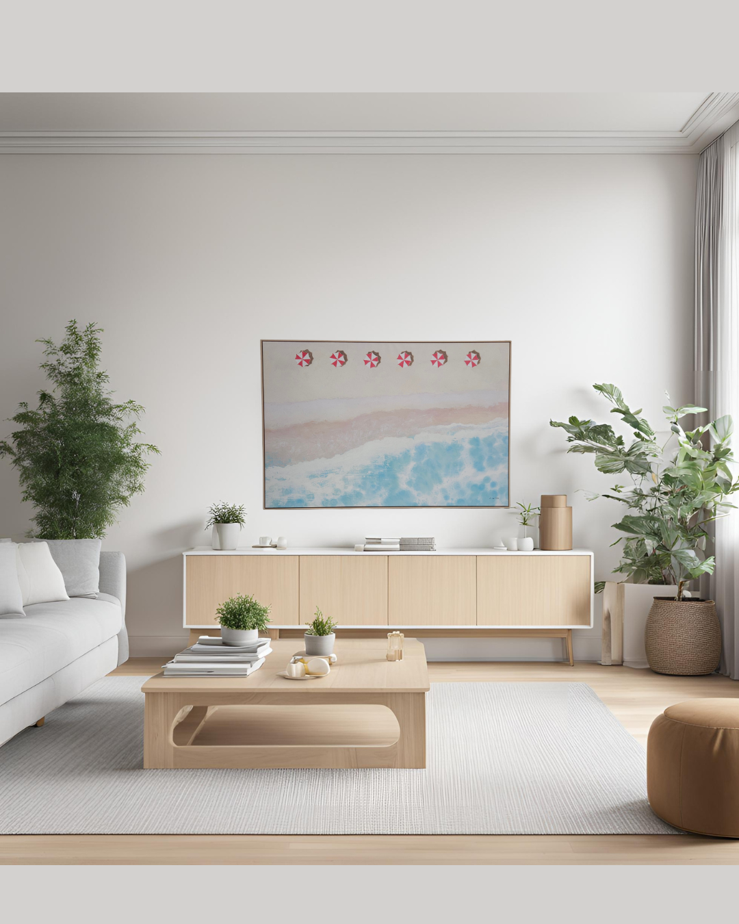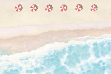This beautiful framed print, featuring charming red and white umbrellas on the beach, is just the touch you need to bring a fresh, coastal vibe to your home.
